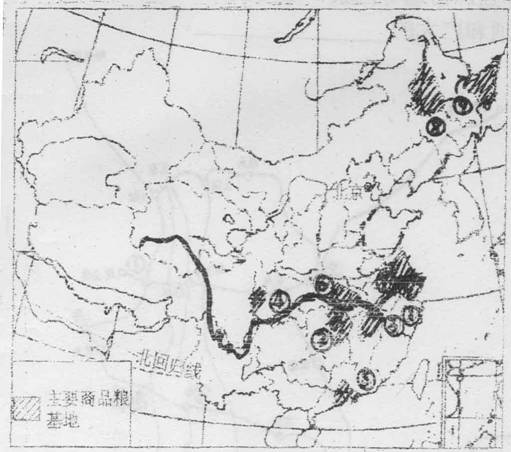 (5)、我国西北部地区没有商品粮基地,原因是 ,那里的农业主要是 业,在“商品粮基地”图上标注四大牧区的名称[2分]。