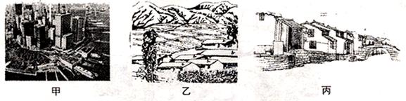 (1)城市和乡村是两种基本的中考资源网聚落类型,上面甲图表示________聚落,这种聚落类型的房屋建筑特点是__ _ __ __ __,居民主要从事 _______________等工作;乙图表示_________聚落。