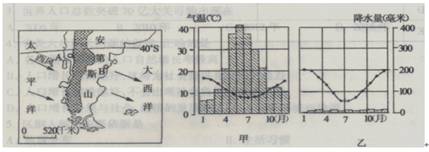 37.读安第斯山脉东西两侧风向图和甲、乙两副气温年变化曲线和逐月降水量图,回答下列问题。(7分)