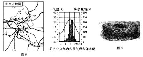 26.(2008.福州中考第二十九届奥林匹克运动会将于2008年8月8日至8月24日在中华人民共和国首都北京举行。读图6、图7、图8,回答下列问题。(8分)