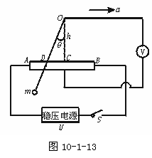如图10-1-13所示是一种悬球式加速度仪.它可以用来测定沿水平轨道做匀加速直线运动的列车的加速度.m是一个金属球,它系在细金属丝的下端,金属丝的上端悬挂在O点,AB是一根长为L的电阻丝,其阻值为R.金属丝与电阻丝接触良好,摩擦不计.电阻丝的中点C焊接一根导线.从O点也引出一根导线,两线之间接入一个电压表V(金属丝和导线电阻不计).图中虚线OC与AB相垂直,且OC=h,电阻丝AB接在电压恒为U的直流稳压电源上.整个装置固定在列车中使AB沿着车前进的方向.列车静止时金属丝呈竖直状态.当列车加速或减速前进时,金属线将偏离竖直方向θ,从电压表的读数变化可以测出加速度的大小.
