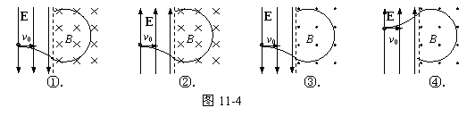 一个带电粒子以初速度v0垂直于电场方向向右射入匀强电场区域,穿出电场后接着又进入匀强磁场区域.设电场和磁场区域有明确的分界线,且分界线与电场强度方向平行,如图中的虚线所示.在如图11-4所示的几种情况中,可能出现的是( )