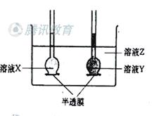 32.如图所示,溶液X中含有绿色染料,溶液Y中含有红色染料,溶液Z中含有蓝色染料。实验开始时,两支漏斗中溶液液面的高度一样。10min后观察的结果是:溶液X液面上升,溶液Y液面下降;溶液X中只有绿色染料,溶液Y中含有了红色和蓝色染料,溶液Z中含有了绿色染料和蓝色染料。下列有关描述中,正确的是
