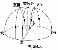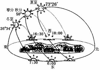 答案:(1)白天太阳在地平线上的视运动的轨迹(2)夏至;73°26′;北回归线(或23°26′N)(3)9 6:00(4)南回归线及其以南地区;南半球(5)东南