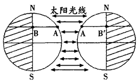 在晨线上看到的是日出,在昏线上看到的是日落。在上图中,选任意一点A,我们来分析一下A地日出日落的方位。因为纬度相同的地方,日出日落的方位也相同,所以我们首先作过A地的纬线,找到该纬线与晨线的交点B、与昏线的交点B"。只要得出太阳光线相对于B地的方向,就可知道A地日出的方位;只要得出太阳光线相对于B"地的方向,就可知道A地日落的方位。可以看出,相对于B地而言,太阳光线来自正东方向,所以在A地太阳从正东方向升起;相对于B"地而言,太阳光线来自正西方向,所以在A地太阳从正西方向落下。