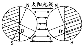 我们讨论一下任意一点C地的日出日落方位,作过C地的纬线,找出该纬线与晨线的交点D、与昏线的交点D",可以看出,太阳光线相对于D地来说来自东北方向;相对于D"地来说来自西北方向,所以,在C地太阳从东北方向升起,从西北方向落下。