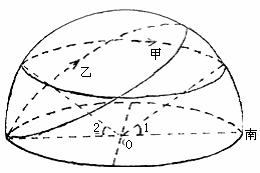 例题3:下图为北半球甲乙两地某日“太阳视运动路线图”,图0为地平圈,箭头为太阳视运动方向,∠1=∠2=22°,据此,完成(1)-(4)题: