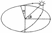下图表示北半球某地某日的太阳视运动路径,图中椭圆为地平圈,太阳位于正南方天空。图中∠α=23°26′,∠β=32°34′。据图完成(1)-(3)题: