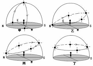 答案:D点拨:甲地处于极昼状态,且一天中太阳高度不变,只有极点有这种情况,又根据甲太阳视运动轨迹偏向南方,为北半球,故甲地为北极点。
