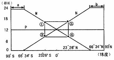 ②不同纬度的地点的昼长或夜长的比较,应比较两地昼弧或夜弧所占据的经度数值的大小,数值越大,时间越长,弧长上每150占据1个小时。