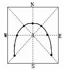 在上图中找任意一点E,用上述同样的方法,可以看到,E地日出的方向是东南,日落的方向是西南。