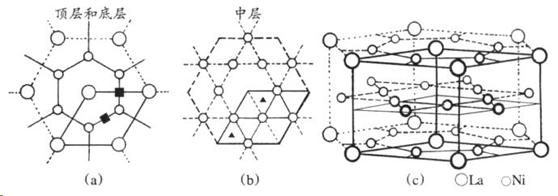 LaNix属六方晶系(图c),晶胞参数a 0=511pm,c 0=397pm。储氢位置有两种,分别是八面体空隙 (“■”)和四面体空隙(“▲”),见图a、b,这些就是氢原子存储处。有氢时,设其化学式为LaNixHy。