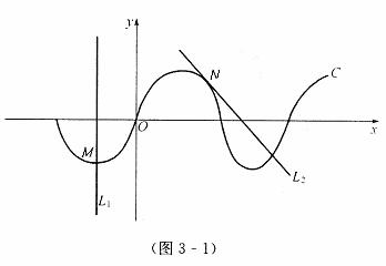 在初中学过圆的切线,直线和圆有惟一公共点时,叫做直线和圆相切,这时直线叫做圆的切线,惟一的公共点叫做切点.圆是一种特殊的曲线,能不能将圆的切线的概念推广为一段曲线的切线,即直线和曲线有惟一公共点时,直线叫做曲线过该点的切线,显然这种推广是不妥当的.如图3-1中的曲线C是我们熟知的正弦曲线y=sinx.直线