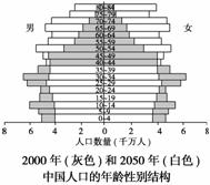 读“中国2000年到2050年人口年龄性别构成图”,完成4-5题。