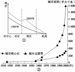 (2009·山东济宁高三质检)下图中,①为“某市同一地区不同时期地价曲线图”,②为“该市城市规模的变化图”。读图回答7-8题。