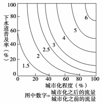 14.依据该模式推论,某都市1970年时城市化程度20%,下水道普及率40%;2000年时城市化程度90%,下水道普及率80%;则2000年的径流量约为1970年时的多少倍 ( )