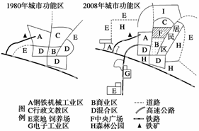 17.(2009·山东济宁高三质检)下面是“我国华北地区某城市1980年和2008年城市功能区分布图”,比较两幅图,回答有关问题。