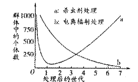 (6分)某种蝇是家禽的毁灭性寄生虫,在一实验室里,用杀虫剂和电离辐射分别处理这种蝇的两个数量相同的群体,电离辐射能导致雄蝇不育,实验结果如下图: