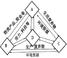 40、如“可持续发展复合系统”示意图,A代表社会系统、B代表经济系统、C代表生态系统、D代表人的管理调控系统,读后回答:(共6分)