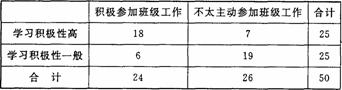 例2 某班主任对全班50名学生学习积极性和对待班级工作的态度进行了调查,统计数据如下表所示: