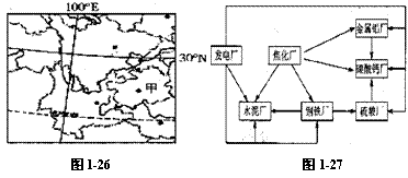 (2)甲地工业区位的优势是____________________。该地附近的朝阳工业园区存在着这样一个工业“生态链”(如图1-27所示),这是“循环经济”理念的一个产物。请从可持续发展的角度分析发展“循环经济"的意义:______________________________。