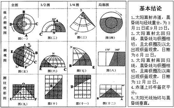 ⑴确定半球或南北纬(极)和东西经; ⑵晨昏线的判读或画晨昏线与光线