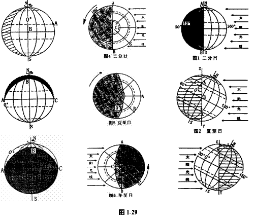 ⑶晨昏线与纬线切点上分别是0点或12点,晨线、昏线与赤道交点上分别是6点或18点。
