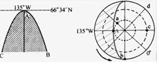 此为俯视图转换为侧视图。左图北极点为中心,且昼夜平分,可知A点坐标为90°E、0°纬度,对比右图,可知两图中A点是同一点,同一时间(春秋分16时)。 |