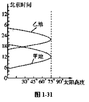[经典题例](探究应用题)读图1-31,即甲(30°N)、乙两地某日太阳高度变化图,完成1-3题。
