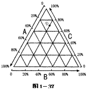 2.平面正三角坐标系:三角坐标图是由一个等边三角形构成的,其读图方法为:变“三轴”为“二轴”,即将一个三角坐标图转化为三个“两轴坐标图”。以图1-37为例,A轴起点0与C轴相交,则A与C构成一个两轴坐标系,过①点作与C轴的平行线,其与A轴的交点就是该点在A轴的数值10%,同理可以读出①点在B轴上的值为20%,在C轴上的值为70%;另外,①点三个数值的总和必然是100%。同理,图中若有其它各点,则各点的三值总和也是100%。