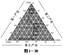 [思路点拨]本题对统计图读图能力要求很高,此为高考出现频率较高的平面正三角坐标图,图中由多点组成了两条折线,分别代表德国和泰国的产业人口构成变化情况。因此,解答此题就必须知道这两国的产业构成特点。根据正三角坐标图的读图方法可以读出图中上面一条折线第一产业比例最大但呈降低趋势,第二产业比例较低,第三产业比例1980年后有明显增加,这当然表示泰国的产业人口构成情况。下面一条折线第一产业从1882年后不断下降,1999年比例很低,第二产业呈先升后降趋势,第三产业比例则不断上升并成为主导产业部门,这肯定是德国的情况。由以上分析对照四个选项,便可以作出正确选择。关于泰国三产业人口构成的变化情况是:在1980-1999年间,一产约下降了23%,二产约上升了7%,三产约上升了16%。由此可见,此阶段泰国农业部门人口数量变化最大。