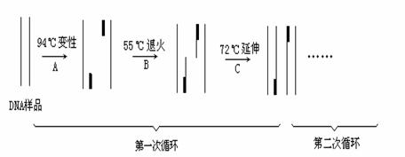 ⑷在DNA鉴定过程中,需大量的DNA, PCR技术(聚合酶链式反应)可以使样品DNA扩增,获得大量DNA克隆分子,该技术的原理是利用DNA的半保留复制,在试管中进行DNA的人工复制(如下图,图中黑色长方形是引物)。在很短的时间内将DNA扩增几百倍甚至几十亿倍,使实验室所需的遗传物质不再受限于活动的生物体。
