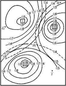 例题:下图是三个同等规模商业中心对周围顾客达成交易的概率的等值线分布图。读图分析回答(1)-(2)题。