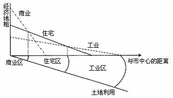 地租从市中心向外波状下降,高峰为市中心,次高峰为放射线与环线交叉点。不同功能在城市不同地域的付租能力不同,即经济地租不同,地租高峰处布局商业区,最高峰为中心商务区,次高峰为一般商业区。地租最低区为工业区。