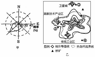 练习题17:下图反映位于平原地区的某城地价分布,甲图表示该市风向频率,乙图中地价等值线数值a、b、c、d、e依次递减。据图回答(1)-(2)题。