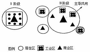 答案:A点拨:Ⅱ阶段,城市中心为商业区,居住人口减少,从市中心向外分别为商业区、住宅区和工业区布局,人口密度住宅区最大,分别向市中心和郊区减小。