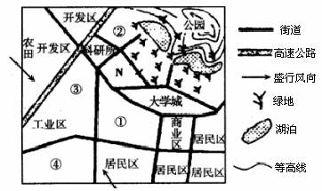 答案:(1)铁路运输条件较好;位于铁矿区附近;冬季严重污染城市大气环境 (2)加强道路建设,修建高速公路;建设中央广场和森林公园;建设居民小区,将重污染工业迁向西南郊区。 (3)菜地和饲养厂的规模扩大,并布置于交通便利的地区 (4)A