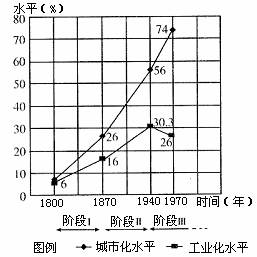 答案:C 点拨:图中两条线不平行,说明城市化与工业化不是同步增长的;阶段I城市化进程速度比阶段Ⅱ慢;该国目前城市化水平高于70%,工业比重开始下降,为发达国家。