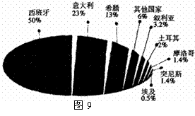 橄榄油被称为“液体黄金”。读图9,2001-2002年世界橄榄油主产国产量比例示意图,完成21-22题。