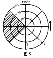 图5斜线部分表示7月7日,非斜线部分表示7月8日,每条经线之间的间隔相等,箭头表示地球自转方向,据此回答7-9题。