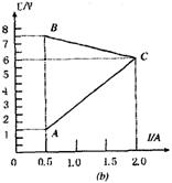 如图(a)电路,当变阻器的滑动片从一端滑到另一端的过程中,两电压表的示数随电流的变化情况如图(b)U一I图像中的AC、BC两直线所示,不考虑电表对电路的影响。下面说法正确的是: