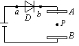 如图所示,D是一只二极管,它的作用是只允许电 流从a流向b,不允许电流从b流向a ,水平放置的平行板电容器AB内部原有电荷P处于静止状态,当两极板A和B的间距稍增大一些后(两极板仍平行),P的运动情况将是( )