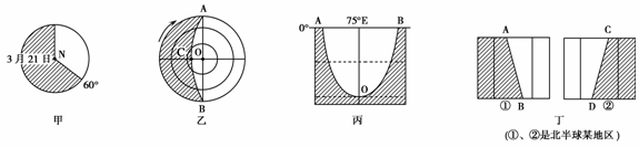 2.比较下面四幅图(注:乙、丙、丁三图中,阴影区为黑夜),回答问题。