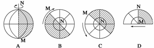 1.(原创题)下面四幅图中所表示的自转方向正确,且NM为晨线的是