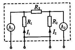 12.如图所示虚线内电路为一较复杂电路的一部分电路,已知R1=3 Ω,R2=4 Ω,R3=2Ω,I1=0.1 A,I2=0.2 A,I1、I2的方向如图所示,则通过电流表A1、A2的电流分别为