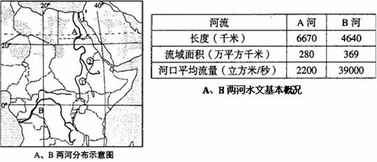 (1)图中A河名称为________,注人地中海;B河名称为刚果河,注入__________。(2分)