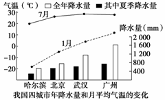 2.读“我国四城市的年降水量变化数据和月平均气温变化数据图”,分析回答(1)-(3)题。