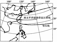 (2008·江苏地理)我国东部地区的主要锋面雨带,通常位于西太平洋副热带高压脊线以北5-8个纬度距离处,并随西太平洋副热带高压的北进南退而移动。下图为“西太平洋副热带高压脊线位置示意图”。读图回答(1)-(2)题。