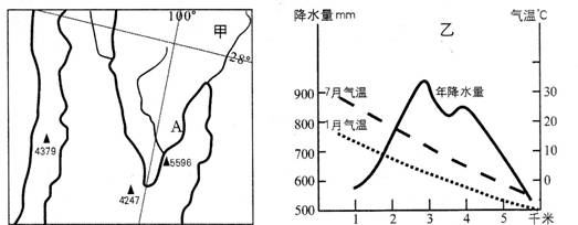 下图中甲图为我国某区域图,乙图为甲图中5596山地的气温、降水与高度的关系。根据以上信息,回答11-12: