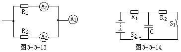 2.如图3-3-13所示电路中,电流表A1和A2均为相同的毫安表,当电路两端接入某一恒定电压的电源时,A1的示数为3mA,A2的示数为2mA.现将A2改接在R2所在支路上,如图中虚线所示,再接入原来的恒定电压电源,那么,关于A1与A2示数情况,正确的是 [ ]